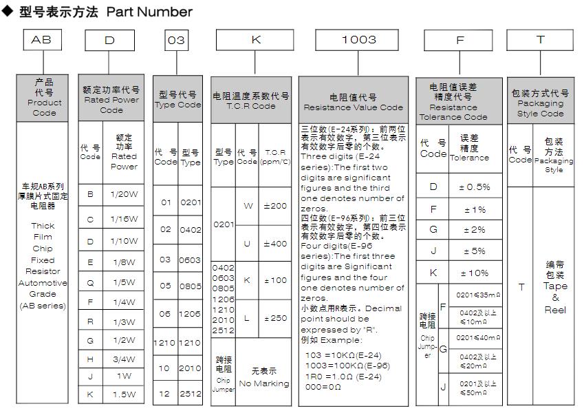 風華車規AB系列厚膜片式固定電阻器型號命名規則: