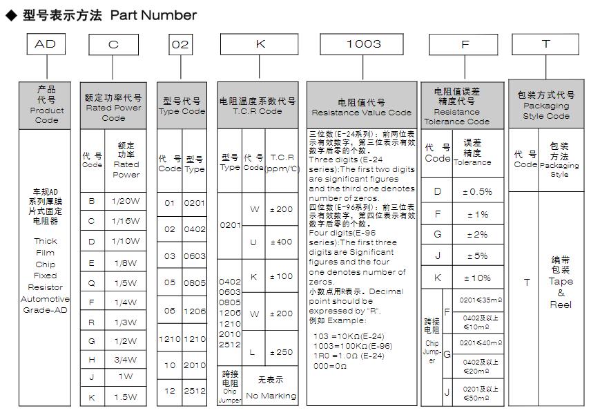 風華車規AD系列厚膜片式固定電阻器型號命名規則: