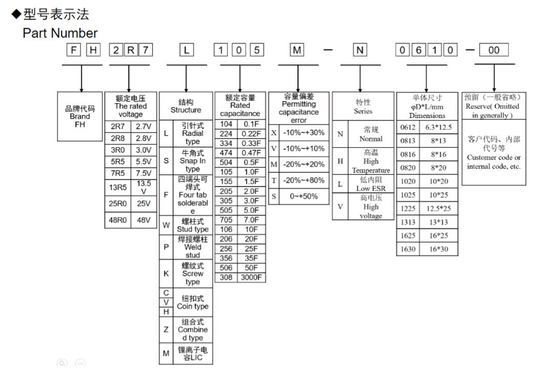 風華高科高溫系列圓柱型超級電容器型號命名規則: