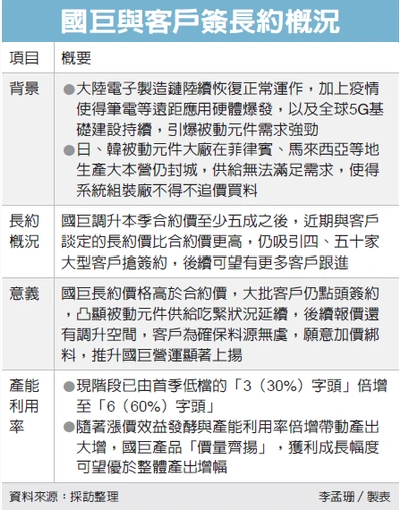 供應(yīng)鏈透露,已有四、五十家以國(guó)巨作為主要被動(dòng)元件供應(yīng)商的大廠,已將過(guò)往向國(guó)巨拉貨約五成的比重改為長(zhǎng)約,期限從簽約日起為期一年,由于合約價(jià)已鎖定,將可確保國(guó)巨獲利,降低未來(lái)大環(huán)境可能的風(fēng)險(xiǎn)。01