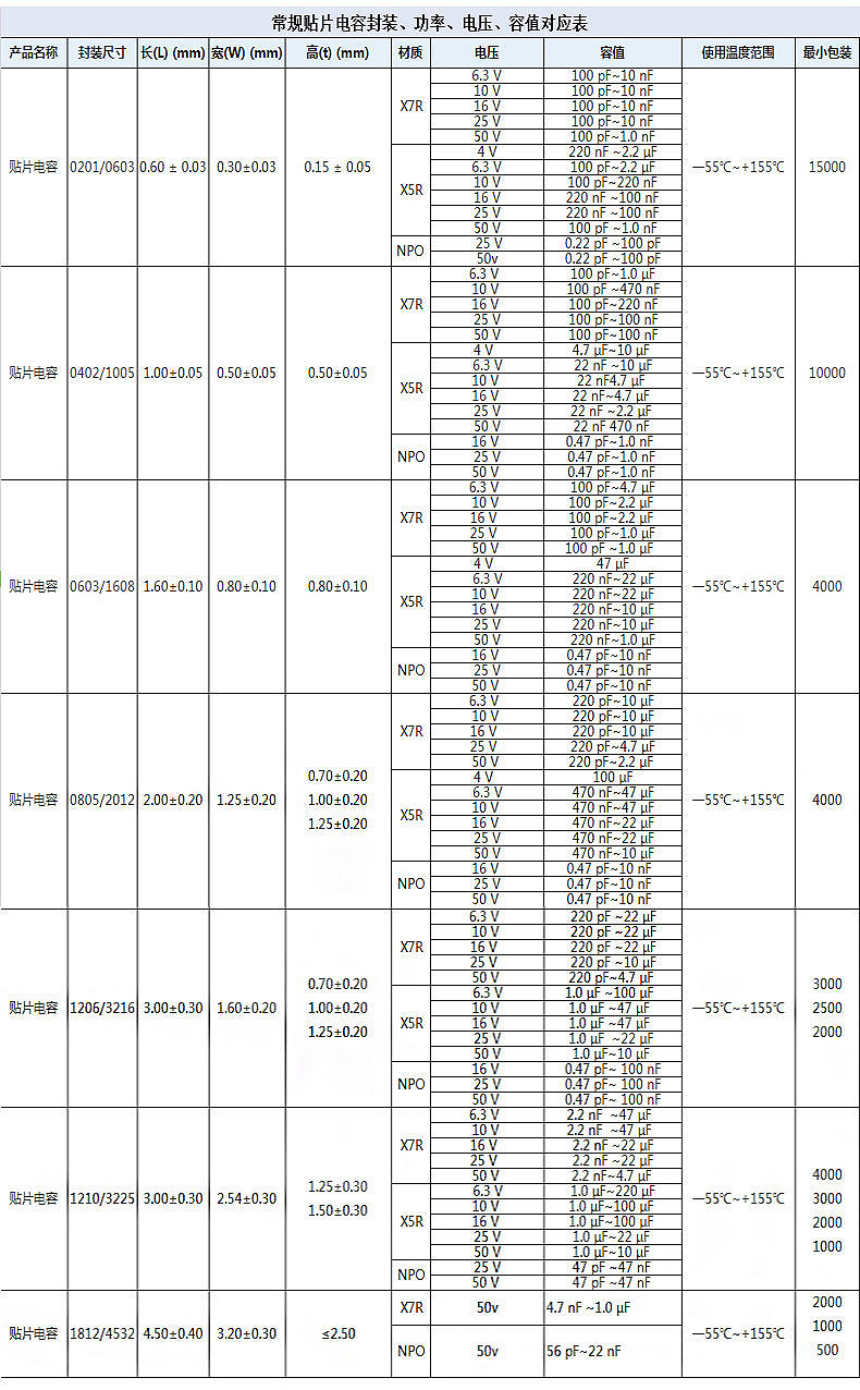 常規貼片電容封裝、功率、電壓、容值對應表: