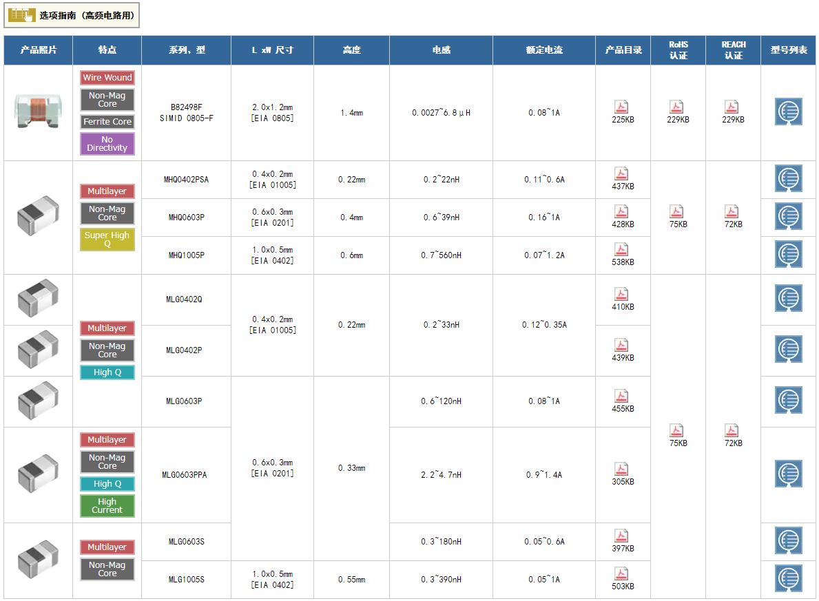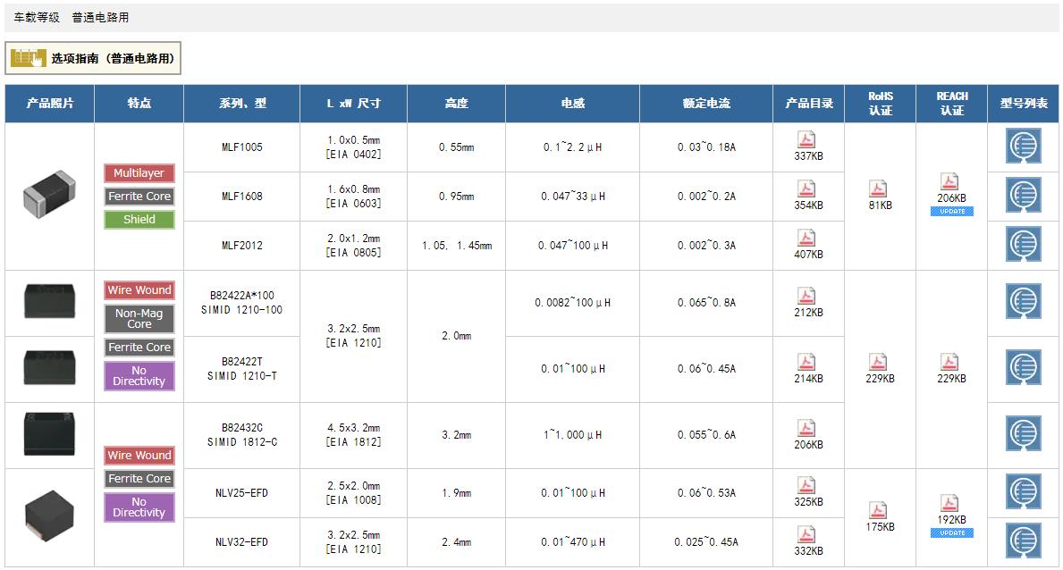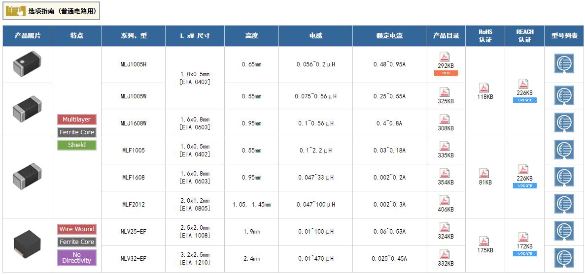 TDK貼片電感:一般等級 高頻電路用 一般等級 普通電路用 一般等級 去耦電路用 一般等級 電源電路用