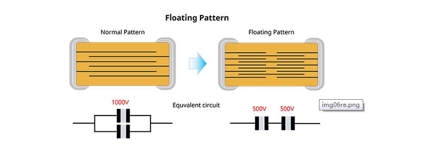 Floating設(shè)計(jì)雖然是在MLCC 發(fā)生Crack時(shí),能夠降低短路風(fēng)險(xiǎn)的結(jié)構(gòu),但是在高電壓下也是非常有用的結(jié)構(gòu)。Floating 結(jié)構(gòu)在MLCC內(nèi)部將電壓按一半分配。例如在MLCC兩端施加1000V電壓時(shí),利用Floating設(shè)計(jì)可將MLCC電介質(zhì)內(nèi)部的電壓降低到1000V的一半,也就是500V。因?yàn)镸LCC的壽命由溫度和電壓決定,而施加在MLCC電介質(zhì)上的Electric field變?nèi)?,所以在可靠性方面便有了?yōu)勢。