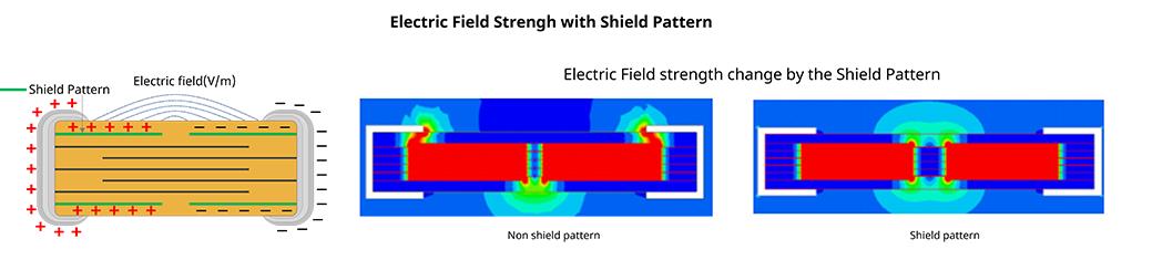 高壓MLCC結(jié)構(gòu)與一般MLCC 相比有何不同呢?在高電壓環(huán)境下需要確??煽啃?。暴露在高壓環(huán)境下的MLCC有Arc-ove的危險(xiǎn),MLCC內(nèi)部存在短路的危險(xiǎn)。當(dāng)向MLCC施加高電壓時(shí),MLCC周圍會(huì)形成強(qiáng)電場(Electric field),進(jìn)而產(chǎn)生ionized air。尤其是在MLCC端電極部位集中了大的電場(Electric field)。如果在Ionized air中超過了啟動(dòng)電壓(inception voltage)就會(huì)發(fā)生電 Arc,MLCC 內(nèi)部就會(huì)有發(fā)生circuit short 的危險(xiǎn)。防止這種現(xiàn)象產(chǎn)生的結(jié)構(gòu)是shield pattern。