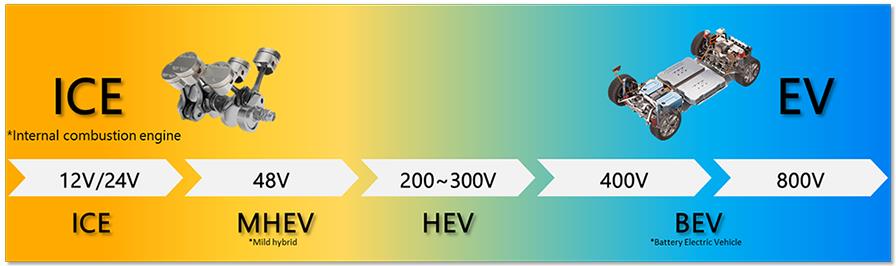 汽車電池的電壓上升與汽車的電氣化有關(guān)。汽車電池的電壓是如何變化的呢?在二十世紀(jì)五十年代中期之前汽車電壓為6V。隨著汽車發(fā)動(dòng)機(jī)容量的增大,需要大功率的Starter Motor,之后增加的電裝設(shè)備使電池電壓標(biāo)準(zhǔn)變?yōu)?2V。初創(chuàng)期的汽車需要的電壓很小,僅用于帶動(dòng)Crank及收音機(jī)。但隨著汽車安全設(shè)備的增加、便利配置的改善等,隨著時(shí)間的推移,增加的電子設(shè)備越來越多。由于所需的電力也隨之增加,關(guān)于在12V系統(tǒng)中提高電壓的問題一直被討論。二十世紀(jì)九十年代提出了42V系統(tǒng),2011年德國汽車制造商制定了48V電壓標(biāo)準(zhǔn)。此后混合動(dòng)力汽車和電動(dòng)汽車開始使用高電壓。電力(Watt)為電壓(V)*電流(A)。提高電壓能夠更有效地提升電力。提升電流的話必須加厚電纜厚度,連接器也需要變更。如果提升電流,硬件成本就會(huì)上升,因此提升電壓更為有效。