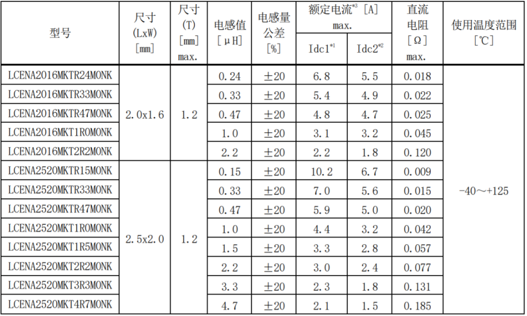 *1 額定電流(Idc1)是負(fù)載直流電流時的電感變化率在 30%以內(nèi)的電流值(at 20℃)