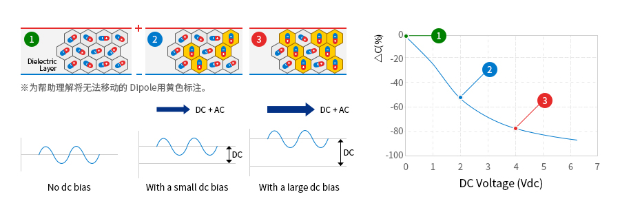 像Class2 產(chǎn)品,電介質(zhì)內(nèi)的 Dipole在加 DC 電壓后,會按照電壓所處的方向整齊排列,當(dāng)所加的 DC 電壓變大,因 DC 電壓而固定方向的 Dipole也會增加。MLCC的容量由對 AC 電壓做出反應(yīng)的 Dipole決定,由DC 電壓固定的 Dipole越多對 AC 電壓做出反應(yīng)的 Dipole 就會越少,從而導(dǎo)致容量下降。