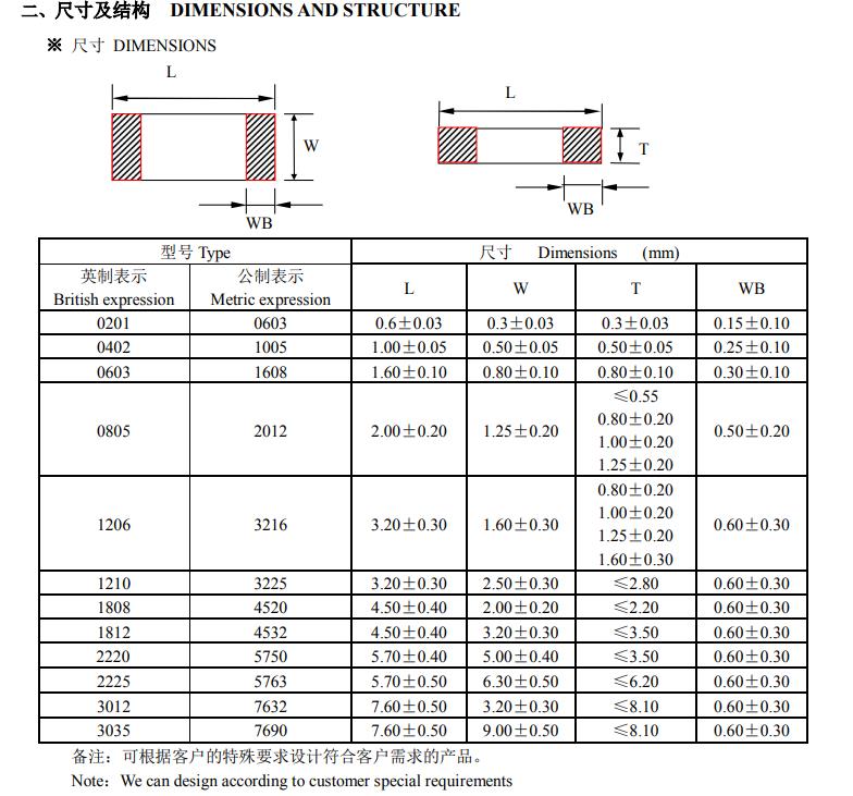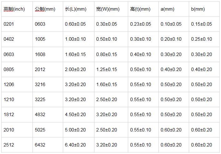 貼片電阻常見的封裝尺寸有九種,有英制公制兩種表示方式,兩種尺寸代碼是由4位數字表示,我們常說的有0201、0402、0603、0805、1206、1210、1812、2010、2512封裝指的就是英制代碼,單位為英制。另外一種為公制,單位為毫米。