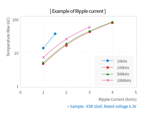 三星電機關于MLCC承受電流的 Spec沒有特定的值。當MLCC加 DC 電壓時,幾乎沒有電流經過 MLCC,因此沒有問題,當加AC 電壓或脈沖電壓時,電流經過電極會出現發熱。三星電機在 Spec Sheet 上有標注相關內容。使用時需要注意因加 AC 電壓或脈沖電壓導致的自身發熱溫度(Self-heating temperature)。 ※ Self-heating Temperatu