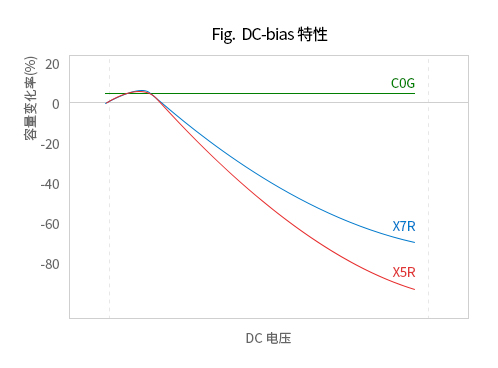 MLCC Class2(X5R, X7R 等) 產品,如下所示,隨著 DC 電壓增加,其容量會漸漸下降。但像Class1 產品 C0G,即使加電壓其容量也沒有任何變化。像Class2 產品,電介質內的 Dipole在加 DC 電壓后,會按照電壓所處的方向整齊排列,當所加的 DC 電壓變大,因 DC 電壓而固定方向的 Dipole也會增加。MLCC的容量由對 AC 電壓做出反應的 Dipole決定,